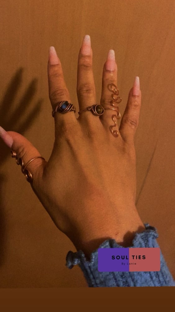 A set of three adjustable copper rings hand-shaped into flowing, organic forms. Each ring is individually sculpted, making every set slightly unique. Designed to stack or wear across multiple fingers for an artistic, earthy look.