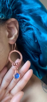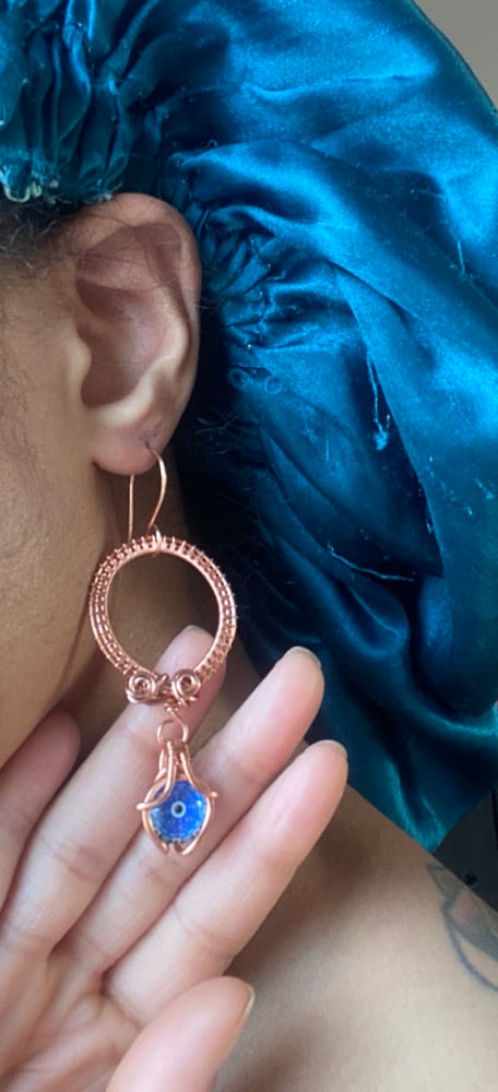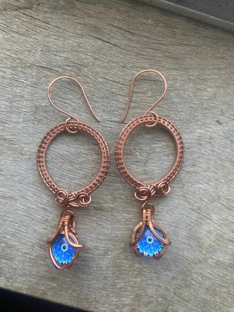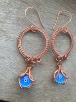 Elevate your look with these handmade wirewrapped copper hoop earrings, featuring dangling 12mm Evil Eye glass charms for a bold, artistic flair
